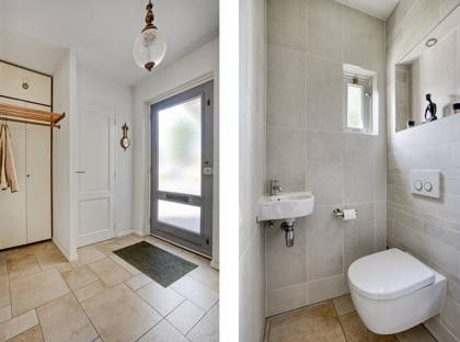 + De ruime entree beschikt over de meterkast, een garderobenis, de toiletruimte met wandtoilet en fonteintje (2015) en de trap naar boven.