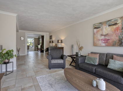 + De L-vormige woonkamer met erker is fraai afgewerkt met spachtelputz wanden, een schuurplafond en sierlijsten. Er is met gemak ruimte voor twee royale zithoeken.