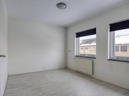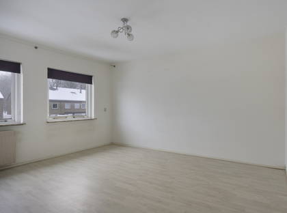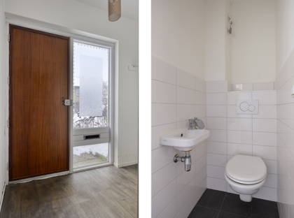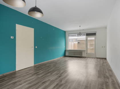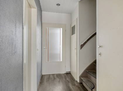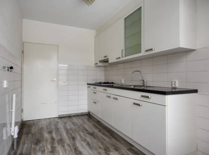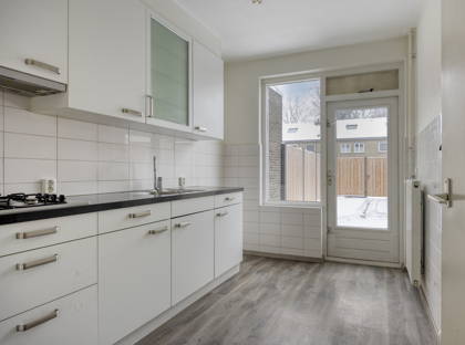 De woonkamer is een fijne doorzonruimte met veel daglicht en een prettige indeling. Aansluitend bevindt zich de separate keuken, voorzien van een 4-pits gasfornuis, met voldoende ruimte om comfortabel te koken. Op de begane grond is daarnaast een toiletruimte en trappenkast aanwezig.
