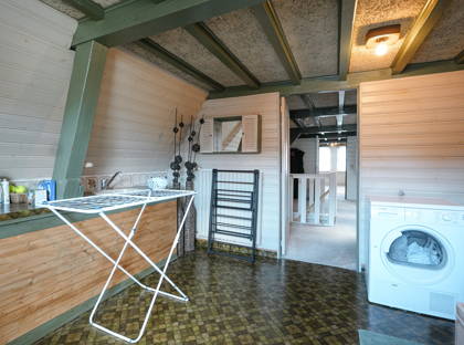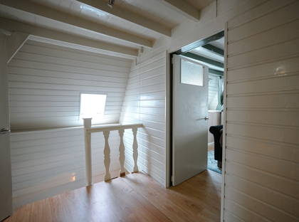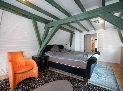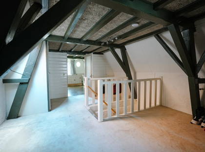 + In een van de slaapkamers vind je niet alleen de cv-ketel, maar ook toegang tot een ruime vliering die zich uitstrekt over de gehele woning – ideaal als extra opslagruimte. De zichtbare houten balken geven de kamer een authentieke en warme uitstraling, die perfect past bij de monumentale sfeer van het huis.