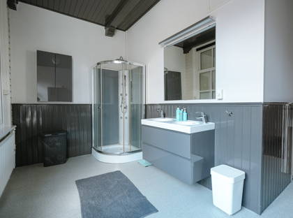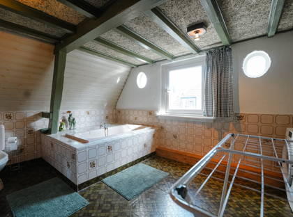 + De tweede badkamer beschikt over een ligbad, toilet en een badkamermeubel met wastafel. Ook vind je hier de witgoedaansluitingen. De klassieke stijl sluit mooi aan bij de rest van de woning en draagt bij aan het comfort dat deze bovenwoning biedt.