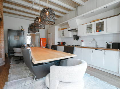 + Ook de woonkeuken is erg ruim en een heerlijke plek om samen te komen. Met voldoende aanrechtblad en opbergruimte, een 5-pits fornuis, afzuigkap, dubbele wasbak en vaatwasser is deze keuken perfect ingericht voor wie graag kookt.