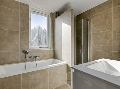Op de verdiepingen bevinden zich vier slaapkamers, waaronder een ruime zolderkamer met dakraam. Op zolder is tevens de aansluiting voor de wasmachine aanwezig. De badkamer is modern en keurig afgewerkt en voorzien van een ligbad, inloopdouche, wastafelmeubel en designradiator. Zowel de badkamer als het toilet beneden zijn voorzien van mechanische ventilatie.