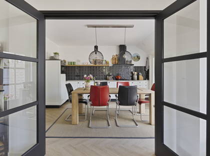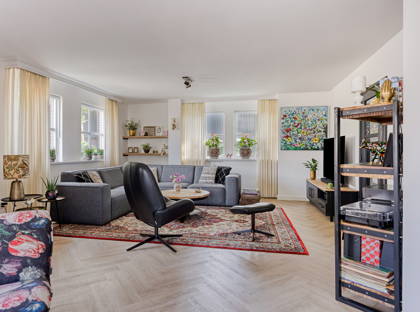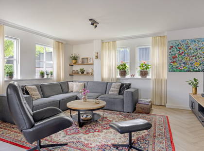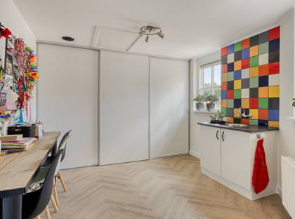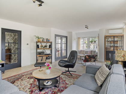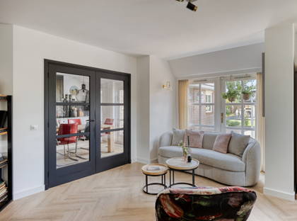 + De woonkamer heeft een licht karakter. Vensters aan twee zijden en de openslaande deuren bij de achtertuin laten het licht ruimschoots binnen. Openslaande deuren geven een doorgang naar de aparte leefkeuken.