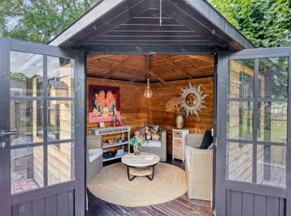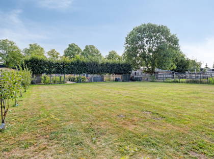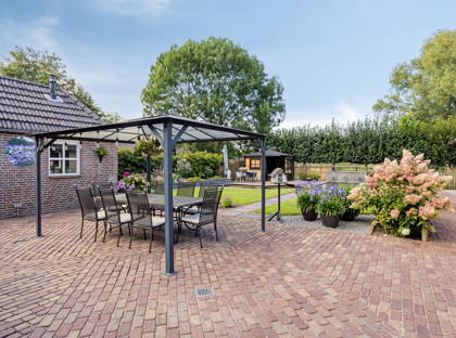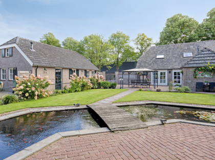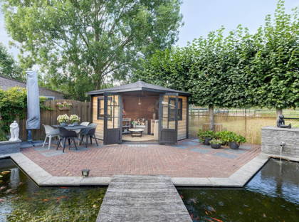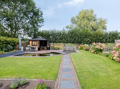 De zee aan ruimte rondom het huis is inderdaad iets dat ook direct in het oog springt. De kavel van bijna 1400 vierkante meter omvat een prachtig aangelegde tuin die aan drie zijden om de woning gaat en ingericht is met een vijverbassin en sfeervol houten tuinhuis met openslaande deuren. Aansluitend ligt zelfs een eigen stuk weiland dat het gevoel van vrijheid nog vergroot.