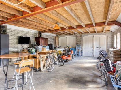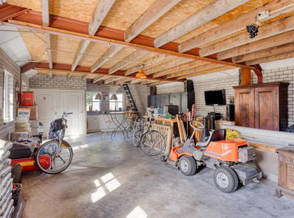 + Parkeren op ruime eigen oprit met plaats voor meerdere auto's en in de dubbele garage. Dubbele hekwerkpoort geeft toegang tot de oprit. De volledig geïsoleerde garage heeft twee dubbele boogdeuren en een buitendeur naar de achtertuin. Achterin is onder twee ramen een keukenblok geplaatst. De riante garage is verder voorzien van drie ramen aan de andere (tuin)zijde, een geiser, grote bergzolder en een geheel betegelde toiletruimte met wandtoilet.