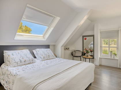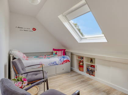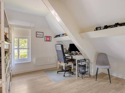 Op de verdieping bevinden zich drie slaapkamers, allemaal met een prettige lichtinval en veel bergruimte in de schuine gedeelten. Verder heb je hier de beschikking over een complete badkamer, een ruime walk-in closet en een bergzolder.