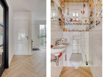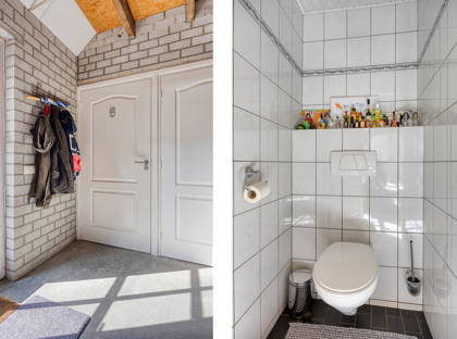 + Via een tussenhal met buitendeur kom je in de bijkeuken. Tussen twee ramen is een compact keukenblok geplaatst. In een kastenwand zijn de aansluitingen voor de wasmachine, droger en ander witgoed. Ook is hier de HR-combiketel geïnstalleerd. Luik geeft toegang tot een bergzolder.