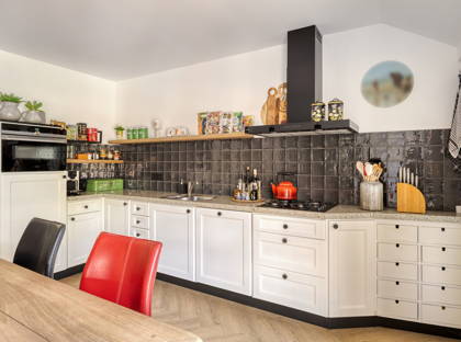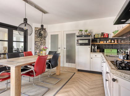 + In de leefkeuken staat een uitgebreid keukenblok in hoekopstelling, uitgevoerd met een 4-pits-gaskookplaat, anderhalve spoelbak, afzuigkap, combi-oven, koelkast en vaatwasser. Bij de openslaande tuindeuren is een mooie plek voor de eettafel.