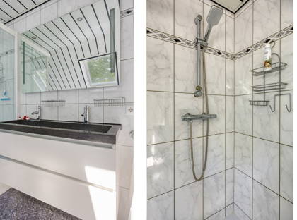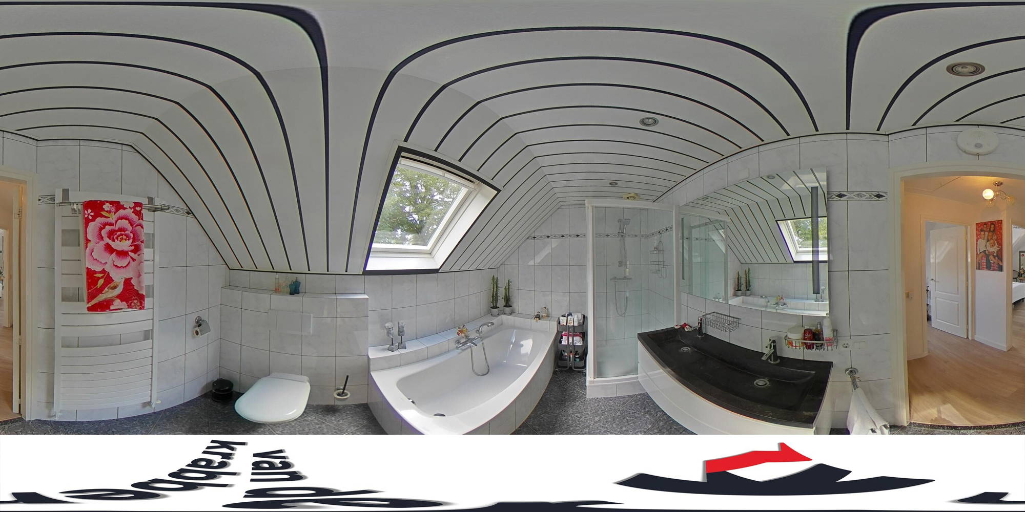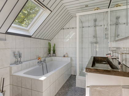 + Complete badkamer is geheel betegeld en uitgevoerd met een dakraam, spotverlichting, ligbad, douche, designradiator, wandtoilet en badkamermeubel met dubbele wastafel.