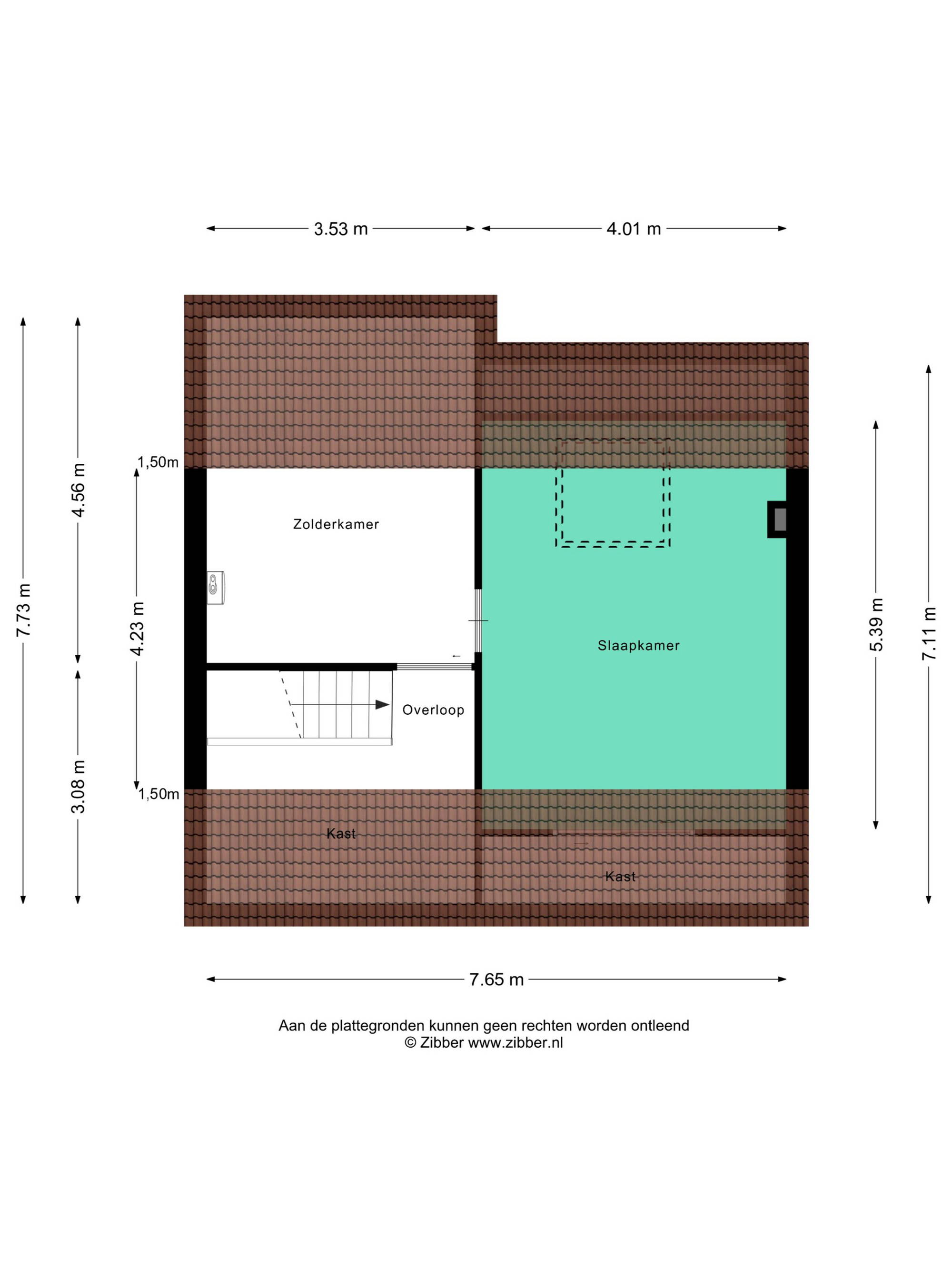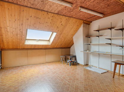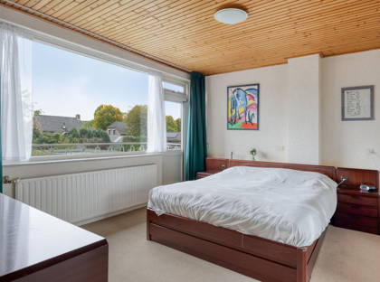 + Vaste trap naar de zolderverdieping met ruime vijfde slaapkamer. Een Velux-dakraam geeft hier een fijne lichtinval. In het schuine gedeelte is met knieschotten veel bergruimte gemaakt.
