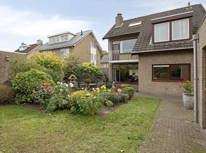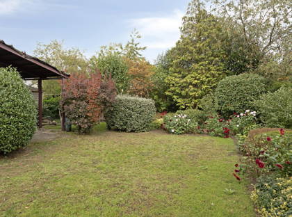+ Achtertuin biedt door de ligging, vormgeving en prachtig groene omranding veel rust en privacy. De tuin is fraai ingericht met bomen, heesters, perken, borders, gazon en verharde terrassen. Boven het terras bij de woning is een brede zonneluifel gemonteerd. Achter de garage is een overkapping geplaatst. Het is een beschutte plek voor een zitje.