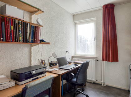 + Extra kamer op de begane grond is ideaal als werk-, studeer- of hobbyruimte. Een raam geeft een fijne inval van licht. In de kamer ligt een grijze pvc-vloer.
