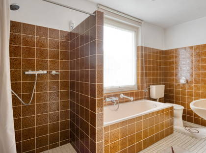+ De badkamer is uitgevoerd met een raam, ligbad, inloopdouche, radiator, toilet en wastafel.