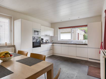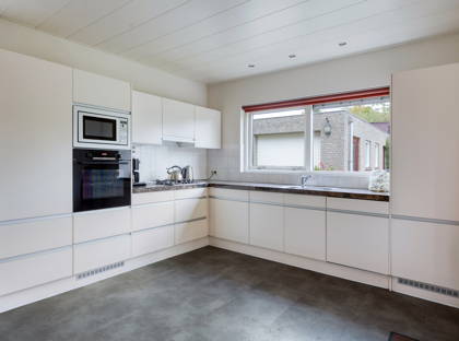 + In de royale leefkeuken is bij een zijraam een mooie ruimte voor een eettafel. Onder een breed venster met uitkijk in de achtertuin staat een modern keukenblok in hoekopstelling. In het plafond erboven is spotverlichting verwerkt. Het kookgedeelte is voorzien van een granieten werkblad, 4-pits-gaskookplaat, afzuigkap, combi-oven, magnetron, koelkast en vaatwasser. Buitendeur geeft een doorgang naar de achtertuin. In de keuken ligt een grijze pvc-vloer.