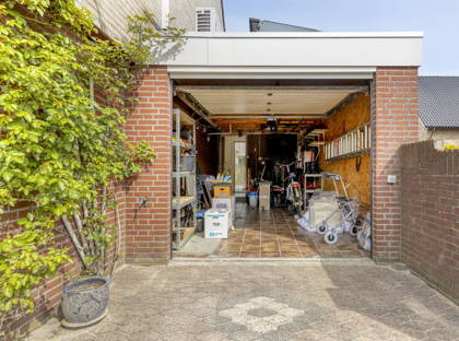 Dankzij het zonnescherm creëert u eenvoudig een schaduwrijke plek op warme dagen, waardoor het hier heerlijk vertoeven is. Achterin de tuin bevindt zich de garage met elektra en een elektrische roldeur, evenals een praktische bijkeuken voorzien van een keukenblok, afzuigkap en wasbak, ideaal voor hobbyisten of extra opslag.