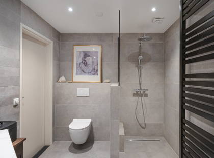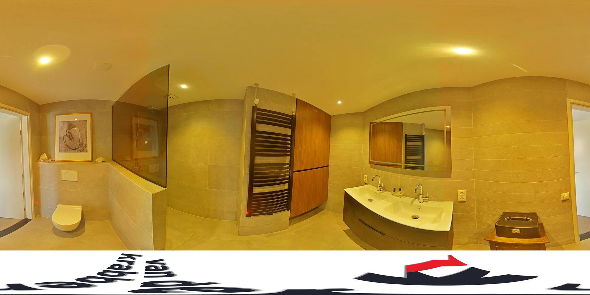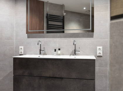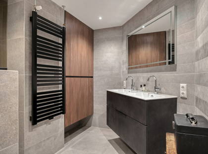+ De badkamer is stijlvol afgewerkt met een inloopdouche, badkamermeubel met dubbele wastafel, wandtoilet, designradiator en mechanische ventilatie.