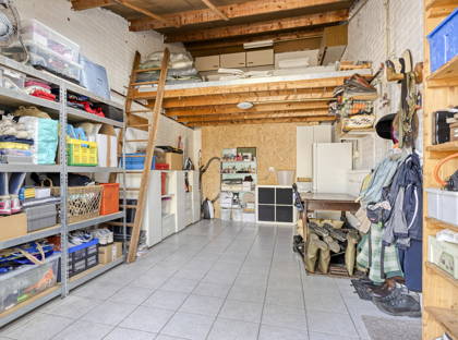 + De entree biedt toegang tot de meterkast met glasvezel, moderne toiletruimte (2021) en de inpandige garage met tegelvloer, dakraam, witgoedaansluitingen en een praktische vliering.