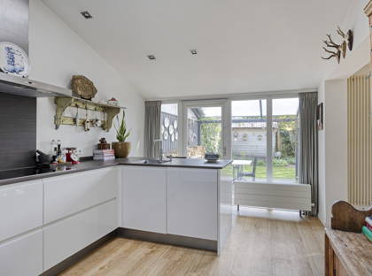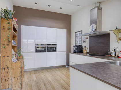 + De moderne woonkeuken is voorzien van een inductiekookplaat, afzuigkap, Quooker kokendwaterkraan, vaatwasser, bar om aan te zitten, breed dakraam en spotverlichting. De ingebouwde kastenwand is daarnaast voorzien van een koelkast, oven en combimagnetron.