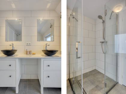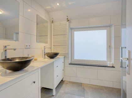 + De badkamer is modern ingericht met een ruime inloopdouche, badkamermeubel met dubbele wastafel, wandtoilet, designradiator en raam dat zorgt voor daglicht en natuurlijke ventilatie.