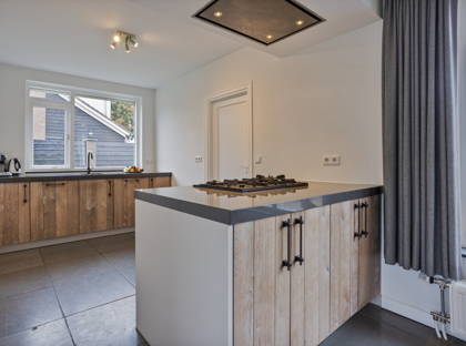 + De open keuken sluit naadloos aan op de woonkamer en is ingericht met een kookeiland met een 5-pitsfornuis en afzuigkap, een vaatwasser en een koelkast.