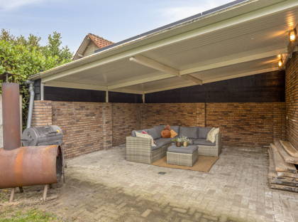 + De tuin is gelegen op het zuiden en biedt de hele dag door zon. Hier vind je een grote overkapping, een royaal terras met zonneluifel, een fraai gazon en een stenen berging.