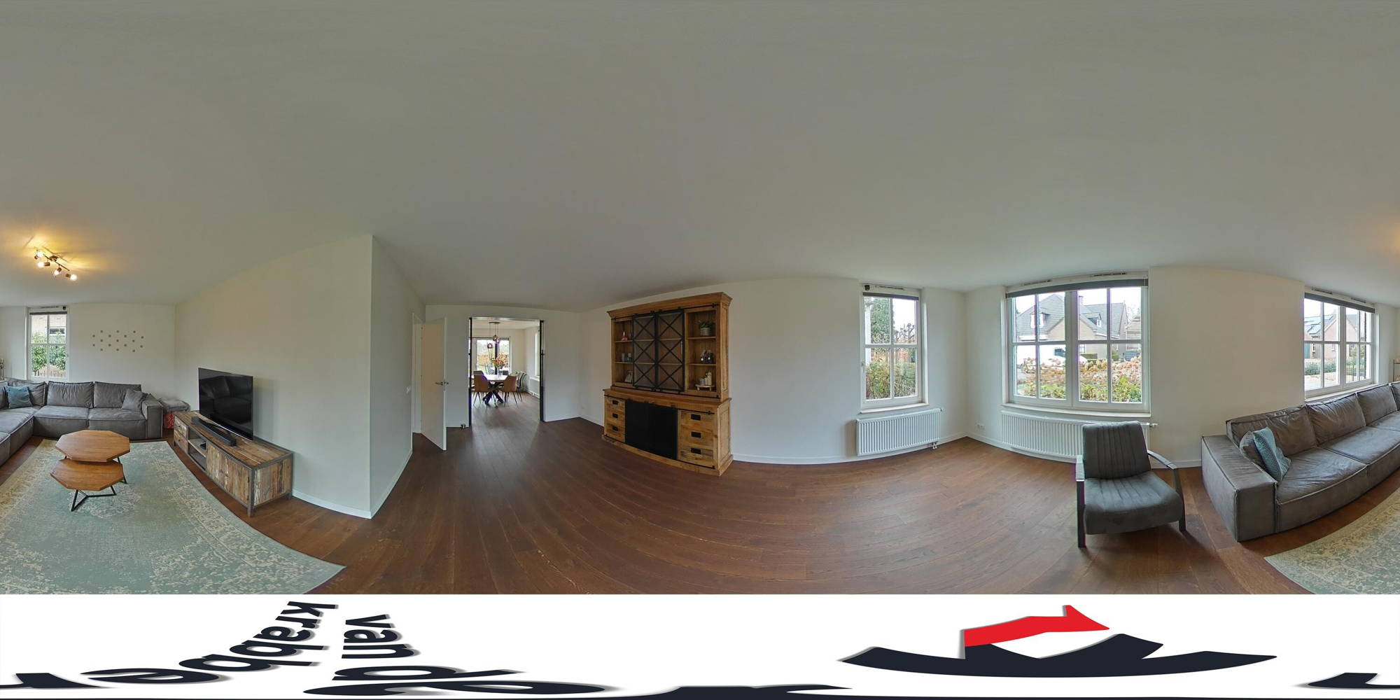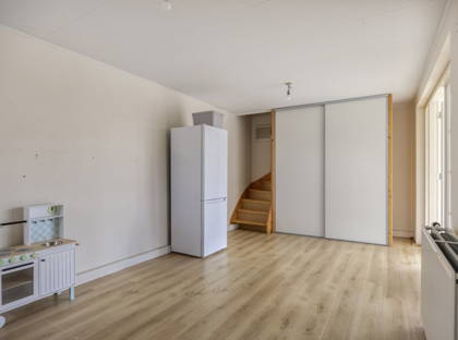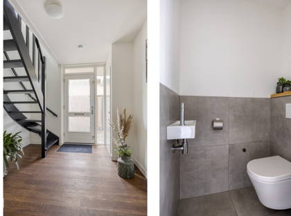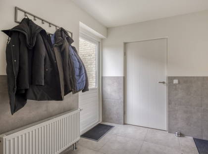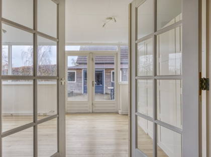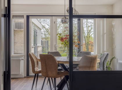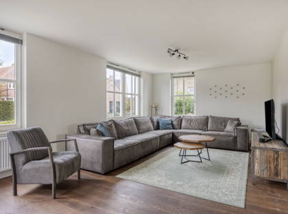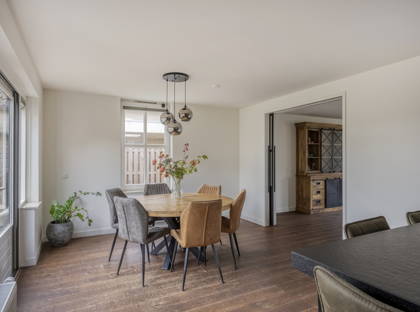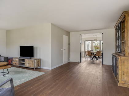 Wanneer je binnenkomt via de zij-entree valt direct de fijne lichtinval en het gevoel van ruimte op. De hal geeft toegang tot het toilet, de trapkast en leidt je verder naar de royale L-vormige woonkamer. Hier zorgen de grote ramen en de massief houten vloer met hoge plinten voor een warme en uitnodigende sfeer. De woonkamer loopt subtiel over in de leefkeuken, gescheiden door stijlvolle ensuite-deuren.