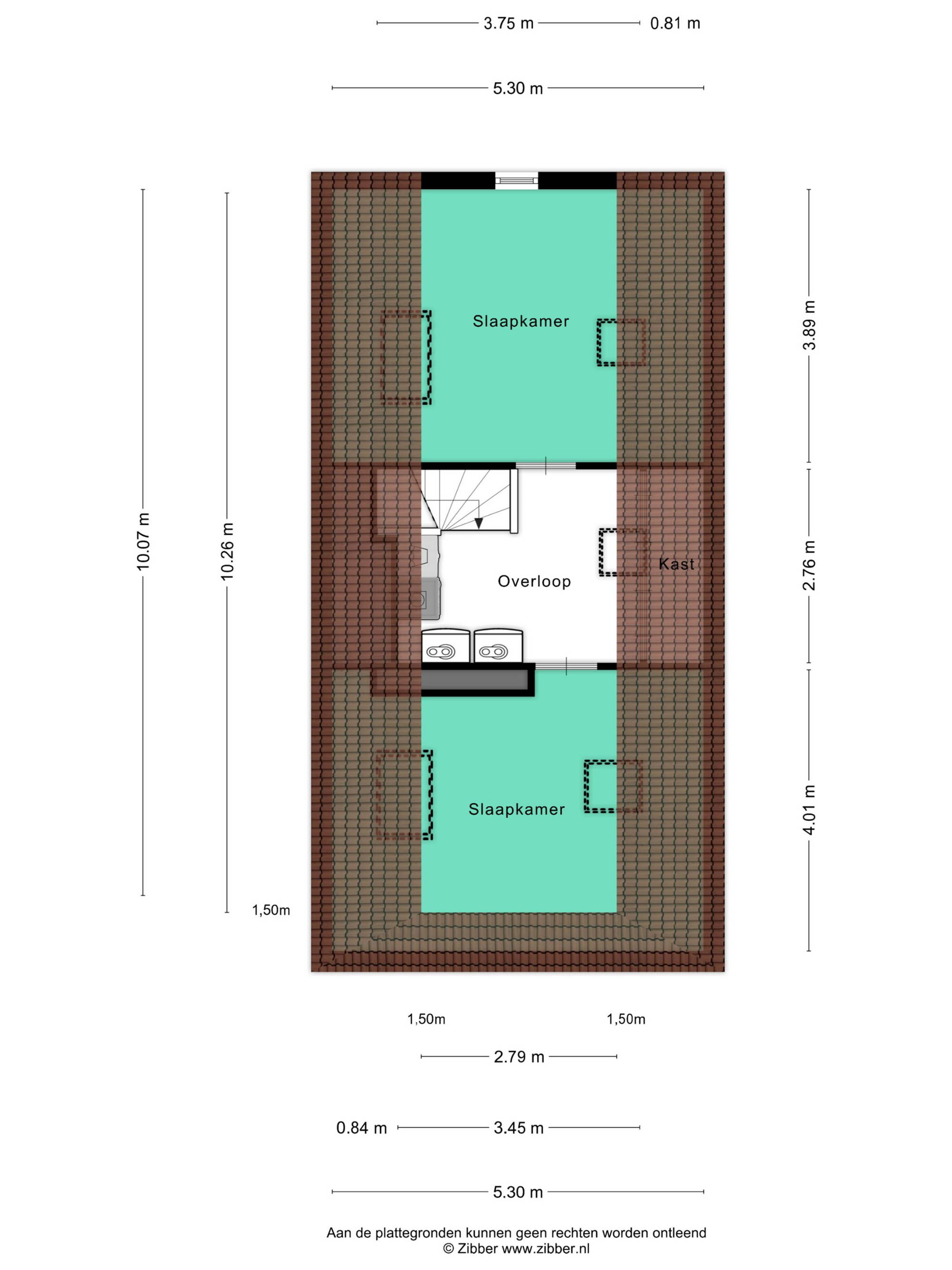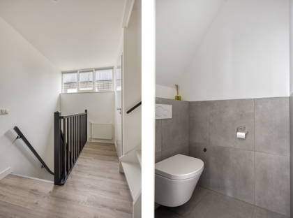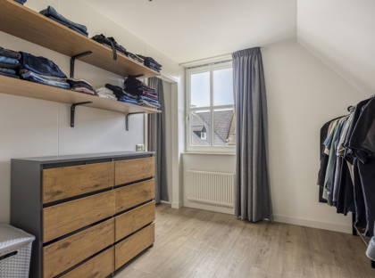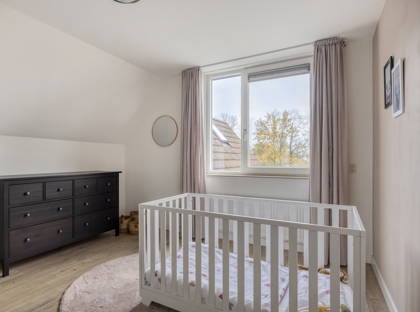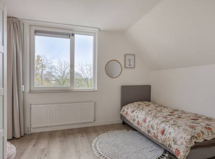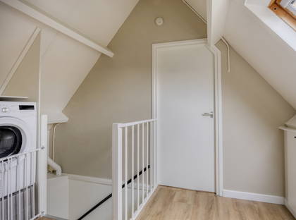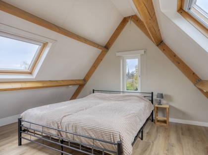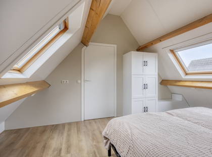 De tweede verdieping is bereikbaar via een vaste trap en biedt verrassend veel extra leefruimte. Op de overloop vind je de aansluitingen voor wasmachine en droger, evenals de Nefit HR-combiketel. Aan weerszijden liggen twee royale slaapkamers, ieder met veel lichtinval dankzij de dakramen.