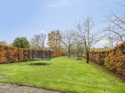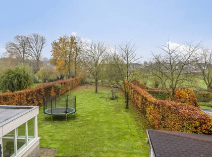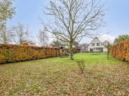 De tuin ligt op het zuidoosten en strekt zich royaal uit richting de achtergelegen landerijen. Omdat de achterkant onbebouwd blijft, geniet je hier van een vrij en weids uitzicht dat ieder seizoen een ander schilderij vormt. Door het subtiele hoogteverschil loopt het terras vloeiend over in het lager gelegen gazon, wat de tuin een speelse en natuurlijke uitstraling geeft.