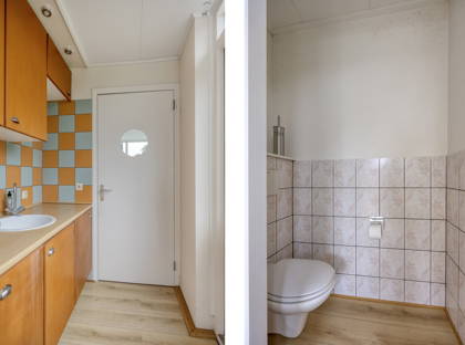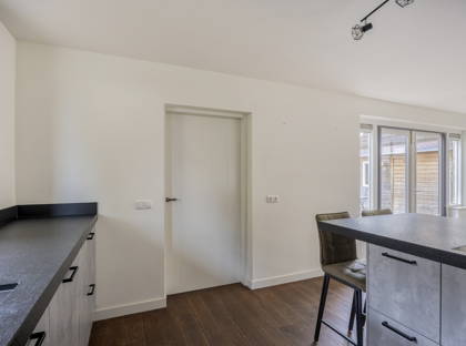 Via een klein tussenhalletje, waar een extra keukenblokje aanwezig is, loop je door naar het multifunctionele bijgebouw. Dit bijgebouw voelt door de vele ramen en openslaande tuindeuren verrassend licht en heeft dankzij de pantry, het toilet en de bovenliggende bergzolder eindeloze mogelijkheden. Denk aan een kantoor aan huis, atelier, salon, hobbyruimte of gastenverblijf. Praktisch, comfortabel en volledig in lijn met de rest van de woning.