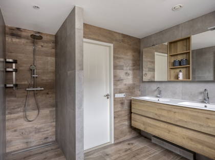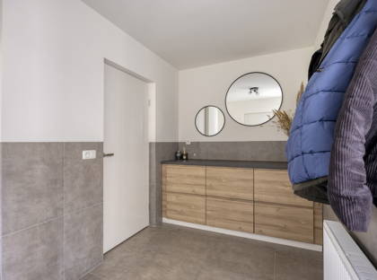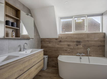 De badkamer, vernieuwd in 2020, straalt luxe en rust uit. Je vindt er elektrische vloerverwarming, een elektrische designradiator, een ligbad, een ruime douche met regendouche en een dubbele wastafel met modern meubel. Op de overloop bevindt zich daarnaast een separaat zwevend toilet, eveneens vernieuwd in 2020, wat de woonlaag extra praktisch maakt.