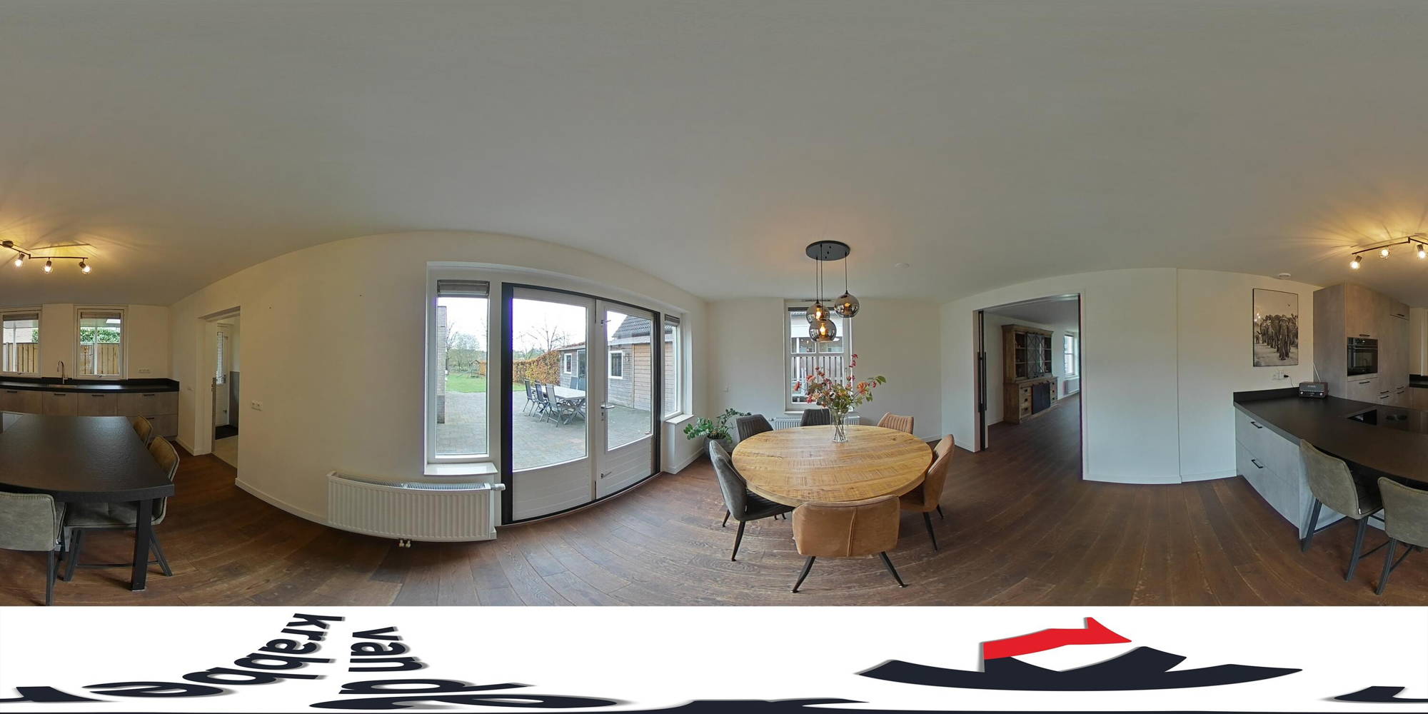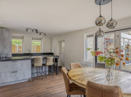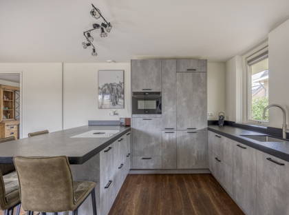 De leefkeuken vormt echt het hart van het huis. De moderne keuken uit 2021 is uitgerust met een centraal kookeiland met BORA-kookplaat, veel bergruimte, een barretje en moderne apparatuur zoals een vaatwasser, koelkast, diepvries en combi-magnetron. Vanuit de keuken heb je een fraai uitzicht op de tuin. Dankzij de openslaande deuren en de elektrisch bedienbare zonneluifel loopt binnen naadloos over in buiten en wordt de tuin een echt verlengstuk van de leefruimte.
