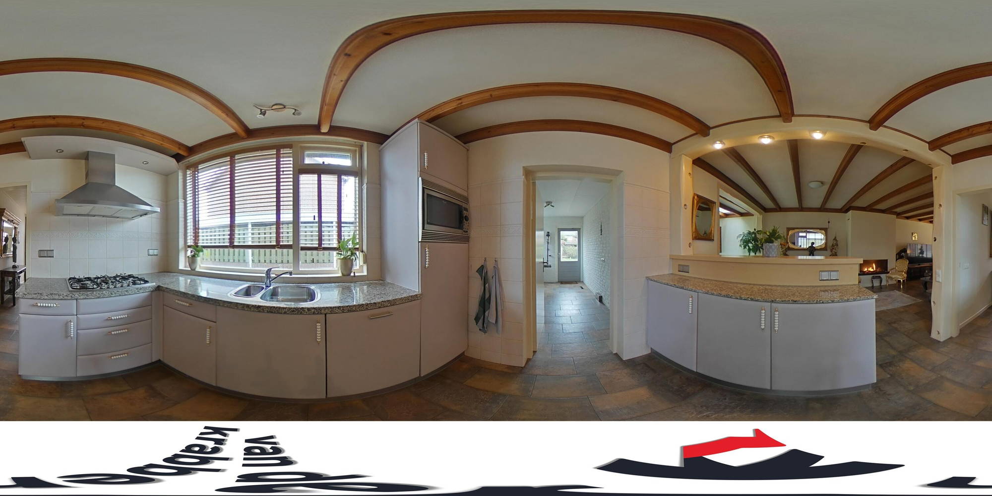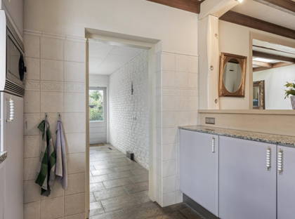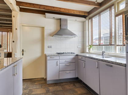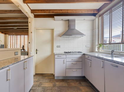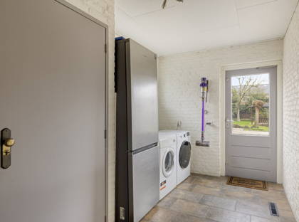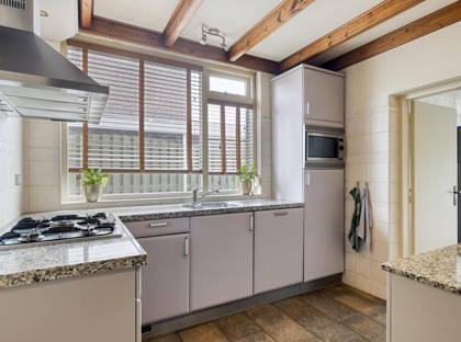De keuken is voorzien van diverse inbouwapparatuur, waaronder een koelkast, gaskookplaat, combi-oven en vaatwasser. Aansluitend bevindt zich de praktische bijkeuken met aansluitingen voor wasmachine en droger en ruimte voor extra apparatuur zoals een tweede koelkast. Vanuit de bijkeuken is er directe toegang tot de achtertuin.