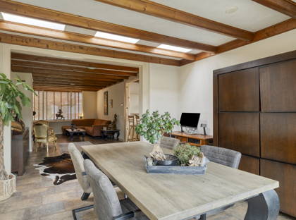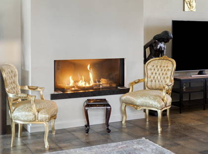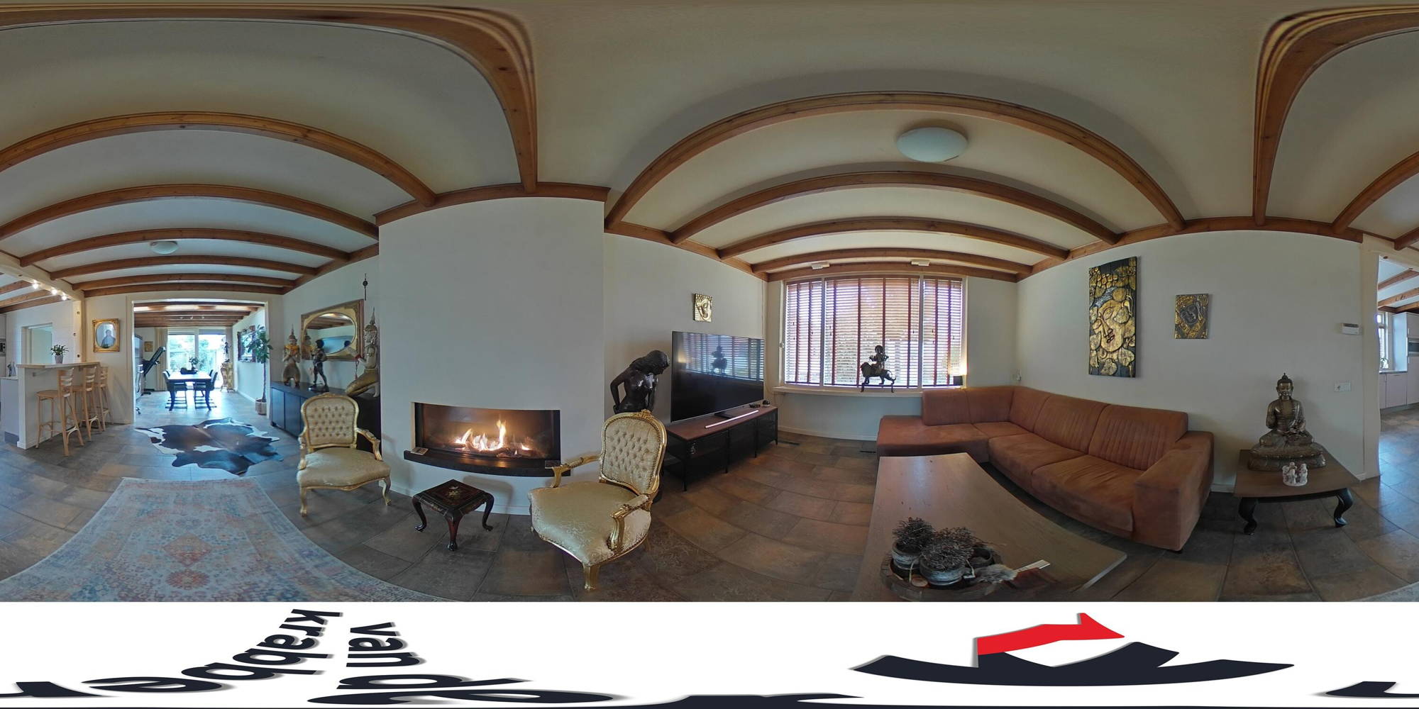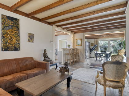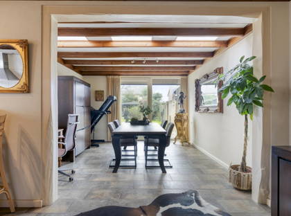 De woonkamer is licht en ruim opgezet dankzij grote raampartijen aan zowel de voor- als achterzijde. De sfeervolle gashaard vormt een prettig middelpunt in de zitkamer en draagt bij aan een warme uitstraling. De open verbinding met de keuken zorgt voor een prettig geheel en maakt deze ruimte bijzonder geschikt voor gezinnen en voor het ontvangen van gasten.