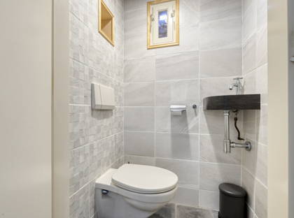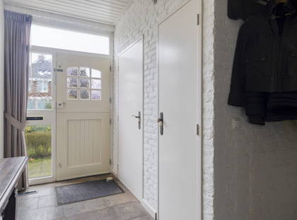 De woning beschikt over een ruime oprit waar met gemak meerdere auto’s kunnen worden geparkeerd. Vanuit hier bereik je de entree en de vrijstaande garage. Bij binnenkomst in de hal tref je de meterkast met slimme meter, het toilet en de toegang tot het woongedeelte. Het toilet is uitgevoerd met een hangend closet, een fonteintje en een raam voor daglicht en ventilatie. De gehele begane grond is afgewerkt met een nette tegelvloer en wordt verwarmd middels hete-luchtverwarming.