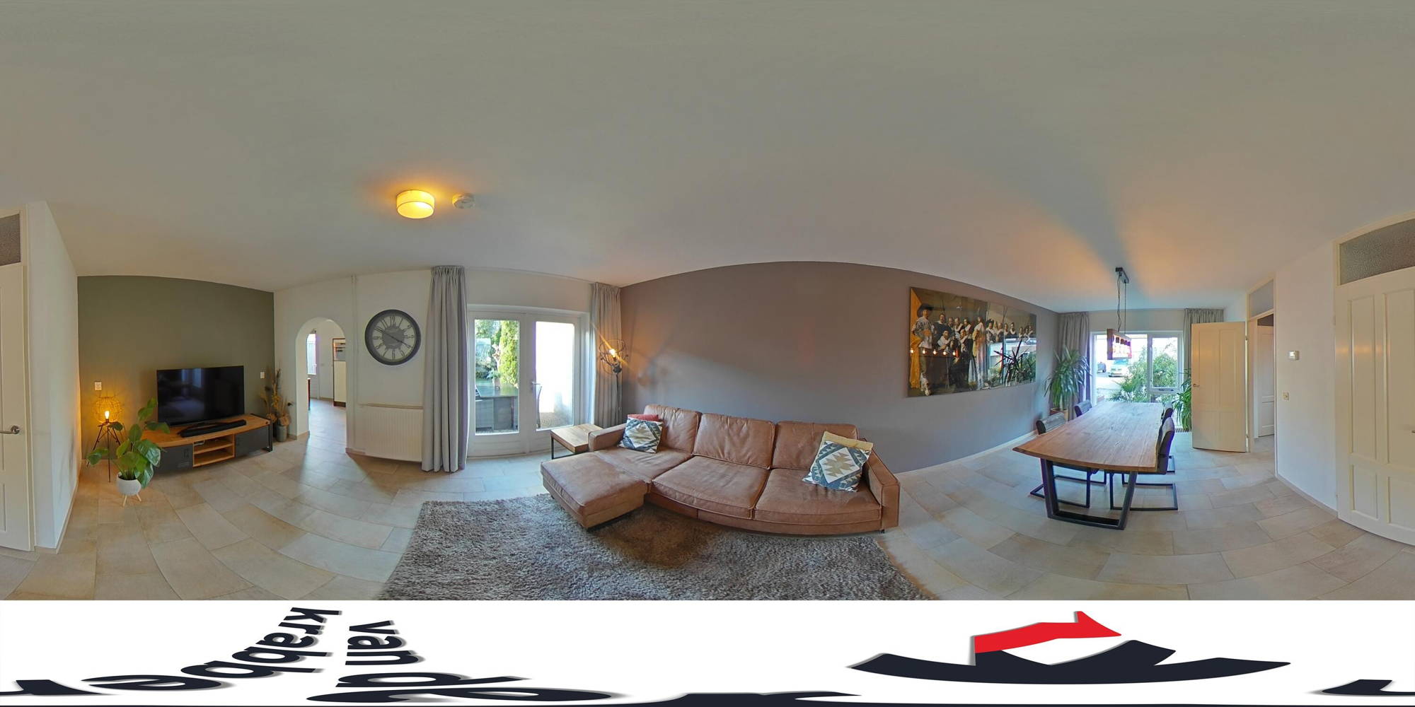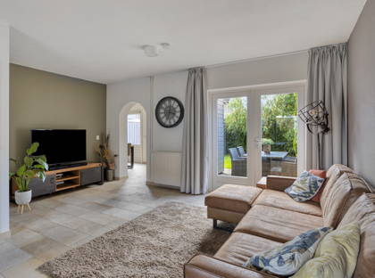 + De woonkamer heeft grote ramen waardoor er veel daglicht binnenvalt, openslaande deuren naar de tuin en een praktische trappenkast