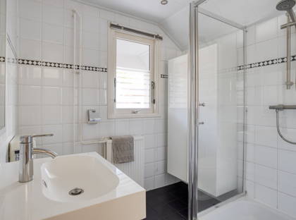 + De volledig betegelde badkamer is compleet ingericht met een douche, badkamermeubel met wastafel, toilet, spotverlichting en mechanische ventilatie