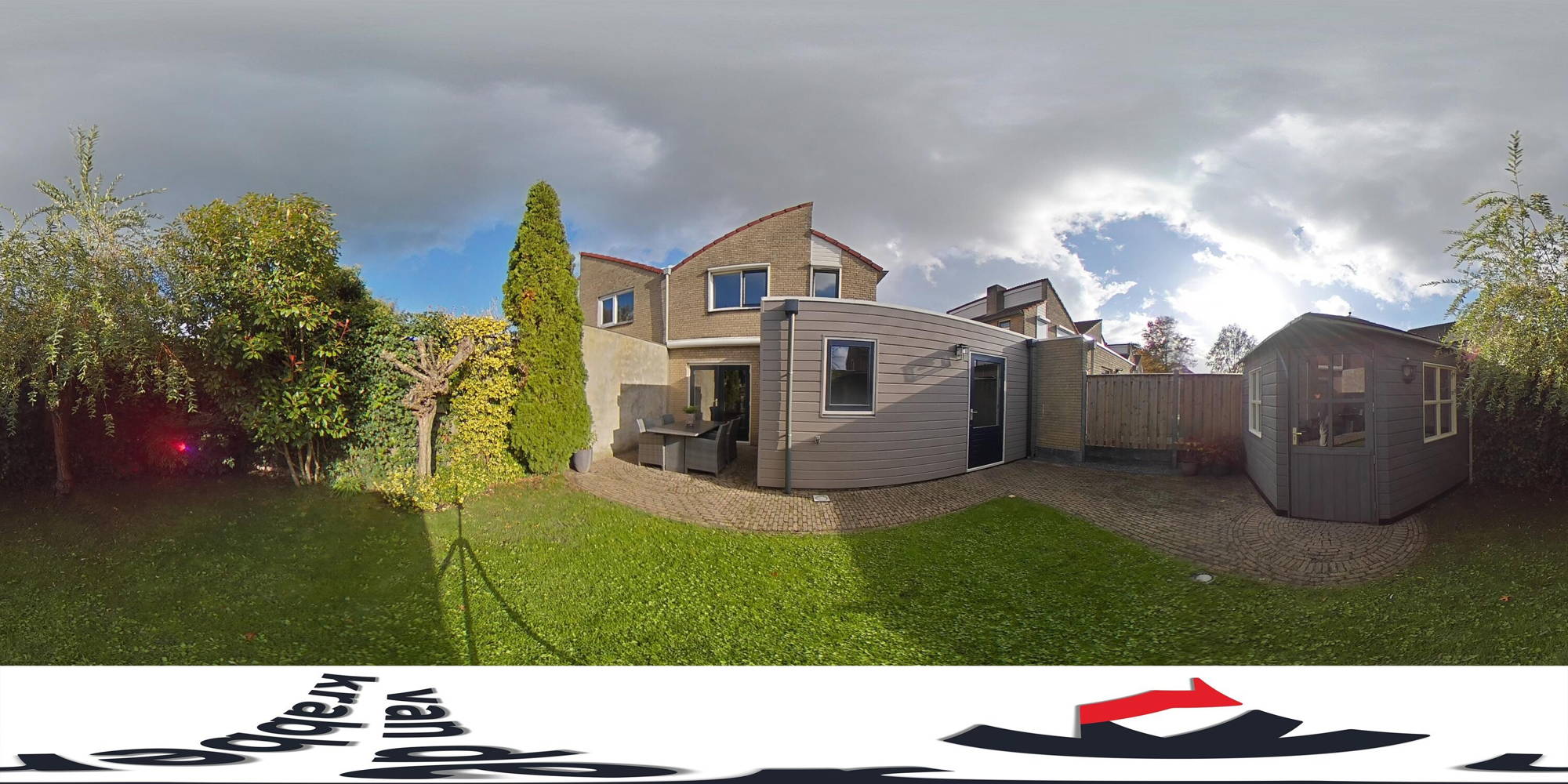 + De achtertuin is verzorgd aangelegd met een groen gazon, een terras met zonneluifel en een houten berging voorzien van stroom