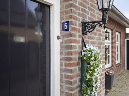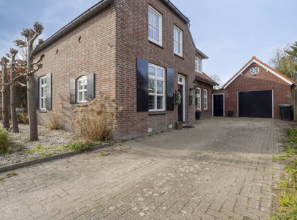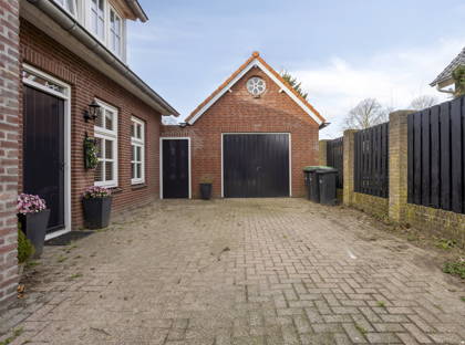 Bij thuiskomst rijd je via een fraai hekwerk met dubbele poort de ruime oprit op. Hier is voldoende plek om meerdere auto’s te parkeren. Daarnaast beschikt de woning over een vrijstaande garage, waar een auto beschut kan worden gestald. Boven de garage bevindt zich bovendien nog een praktische bergzolder.