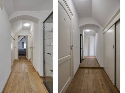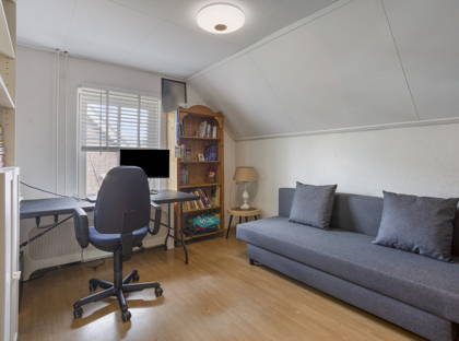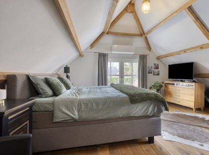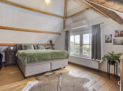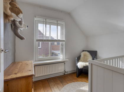 Op de verdieping bevinden zich vier slaapkamers, stuk voor stuk ruim en voorzien van een prettige lichtinval. Drie kamers zijn afgewerkt met een houten vloer en één met laminaat. De royale hoofdslaapkamer boven het achterhuis heeft een bijzonder karakter dankzij de zichtbare houten draagbalken. Het lage raam biedt bovendien een mooi uitzicht op de achtertuin.