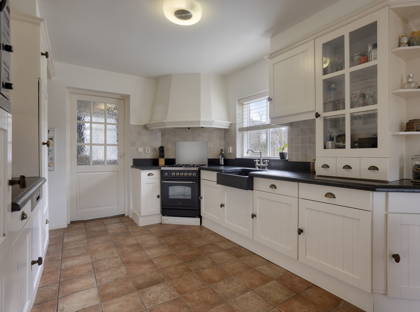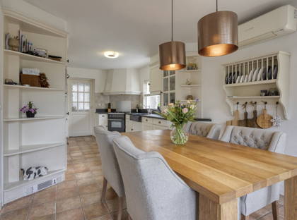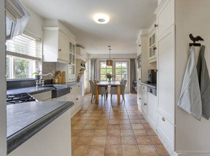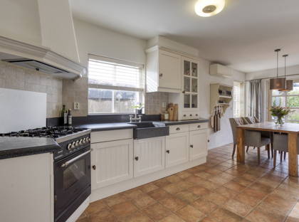 De ruime woonkeuken vormt een fijne plek voor het hele gezin, met volop ruimte voor een grote eettafel. Vanuit de eethoek geven dubbele openslaande tuindeuren direct toegang tot de achtertuin. De plavuizenvloer uit de hal loopt door in de keuken en benadrukt het landelijke karakter. De keuken is uitgerust met een natuurstenen werkblad met verzonken spoelbak en een keukenopstelling met onder andere een Boretti gasfornuis met 4-pits gaskookplaat en oven. Daarboven bevindt zich een Itho afzuigkap verwerkt in een sierlijke schouw. Daarnaast is er een uitgebreide keukenwand met diverse inbouwapparatuur, waaronder een Bosch combimagnetron, Bauknecht koelkast en Bosch vaatwasser. Ook beschikt de keuken over een praktische kelderkast.