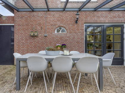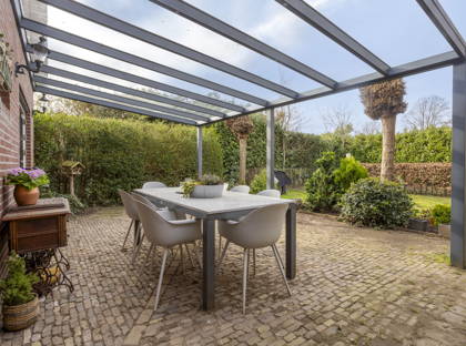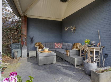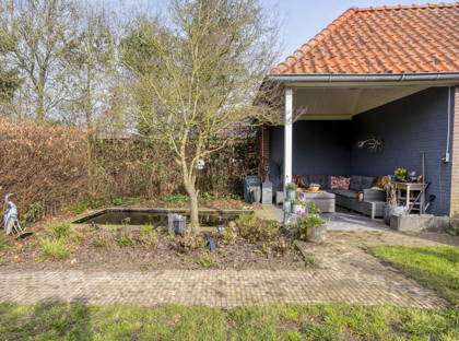 De achtertuin biedt volop rust, privacy en zon. Dankzij de gunstige ligging kun je hier lange tijd van de zon genieten. Bij de woning ligt een ruim en licht verhoogd terras, ideaal om buiten te zitten. Daarnaast is er een gezellige veranda achter de garage met uitzicht op de (koi)vijver, waar je beschut kunt ontspannen.