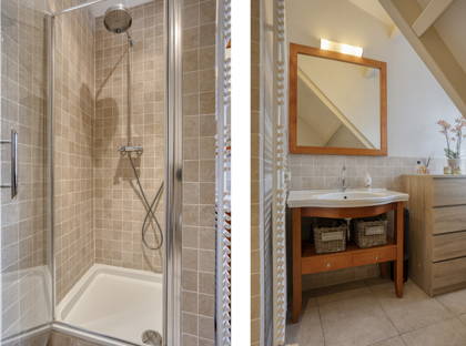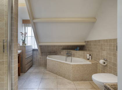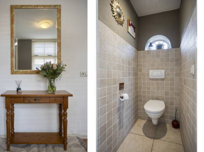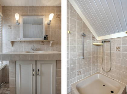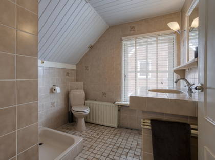 De woning beschikt over twee badkamers. De badkamer bij de hoofdslaapkamer is sfeervol ingericht met een balkenplafond en tegels in warme tinten. Hier vind je een ligbad, douchecabine, wandtoilet en een karakteristiek wastafelmeubel met spiegel. De tweede badkamer beschikt over een douche (geschikt voor kinderen tot circa 1.30 m), een toilet en een wastafelmeubel. Beide badkamers zijn voorzien van een groot raam, wat zorgt voor veel licht en natuurlijke ventilatie.