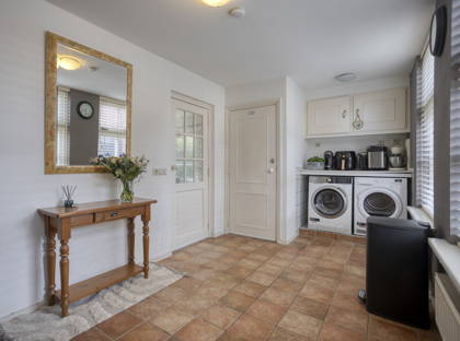 Grenzend aan de keuken ligt een ruime bijkeuken met volop bergruimte en aansluitingen voor wasmachine en droger. Tevens bevindt zich hier het toilet. Via de buitendeur kom je vanuit de bijkeuken direct op de oprit naast de woning.