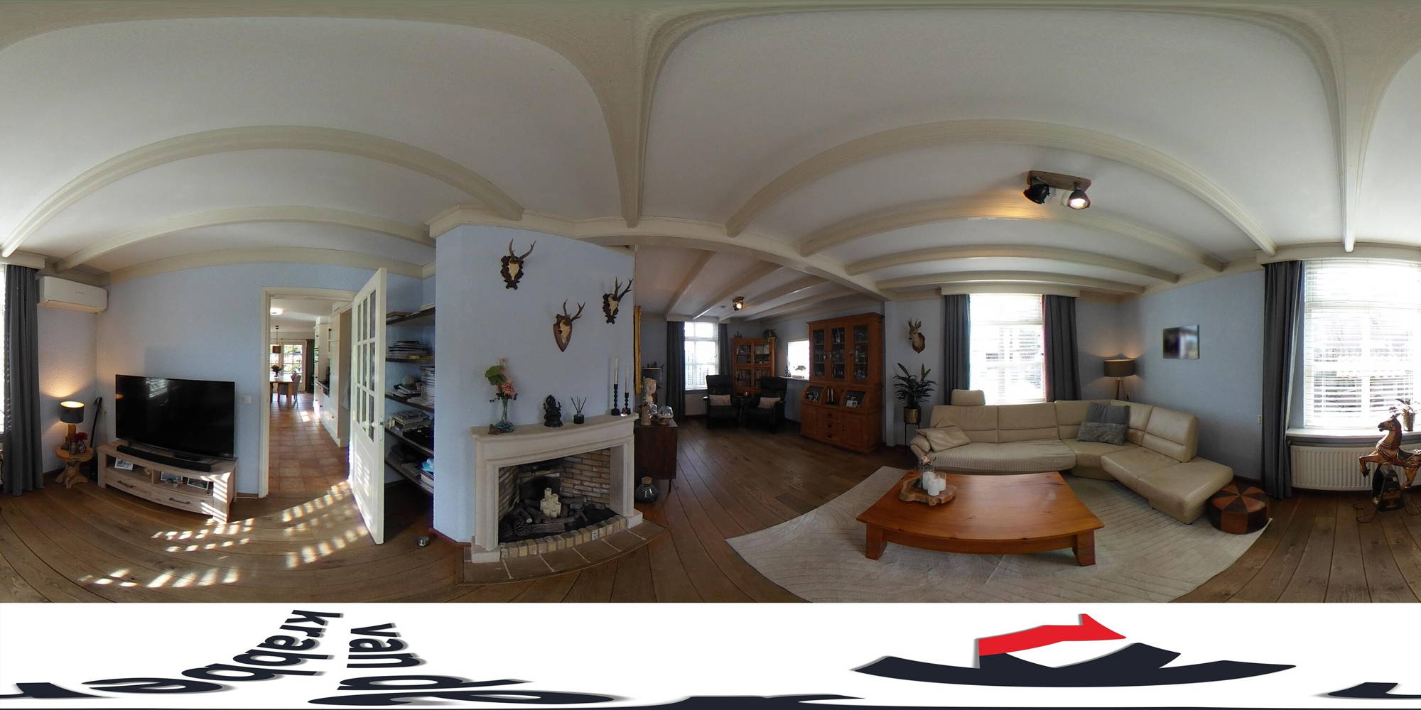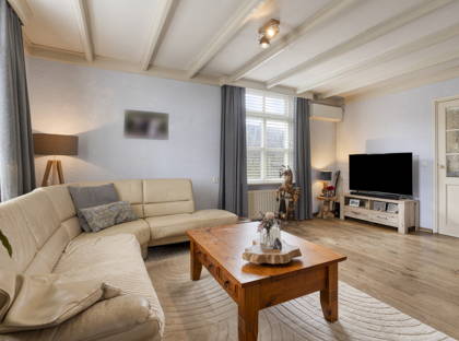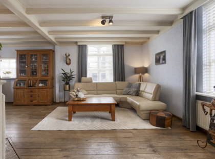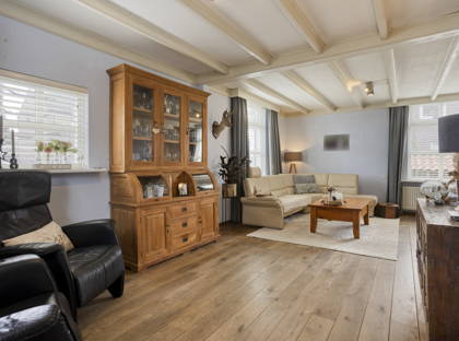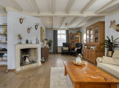 Binnen valt direct de prettige combinatie van karakter en comfort op. In de hal ligt een rustieke plavuizenvloer, waarna in de woonkamer een stijlvolle eikenhouten vloer en een fraai balkenplafond volgen. De woonkamer is heerlijk licht dankzij grote ramen in de voor-, zij- en achtergevel, waardoor het daglicht rijkelijk naar binnen valt en er mooie zichtlijnen ontstaan. In de zitkamer aan de tuinzijde zorgt een open gashaard (2003) voor extra warmte en sfeer.