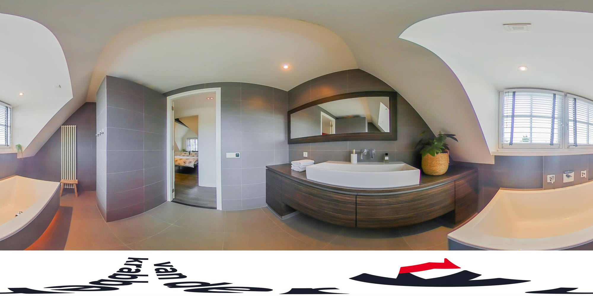 + De luxe badkamer met dakkapel is ingericht met een ligbad, ruime inloopdouche, modern badkamermeubel met wastafel, designradiator en elektrische vloerverwarming.