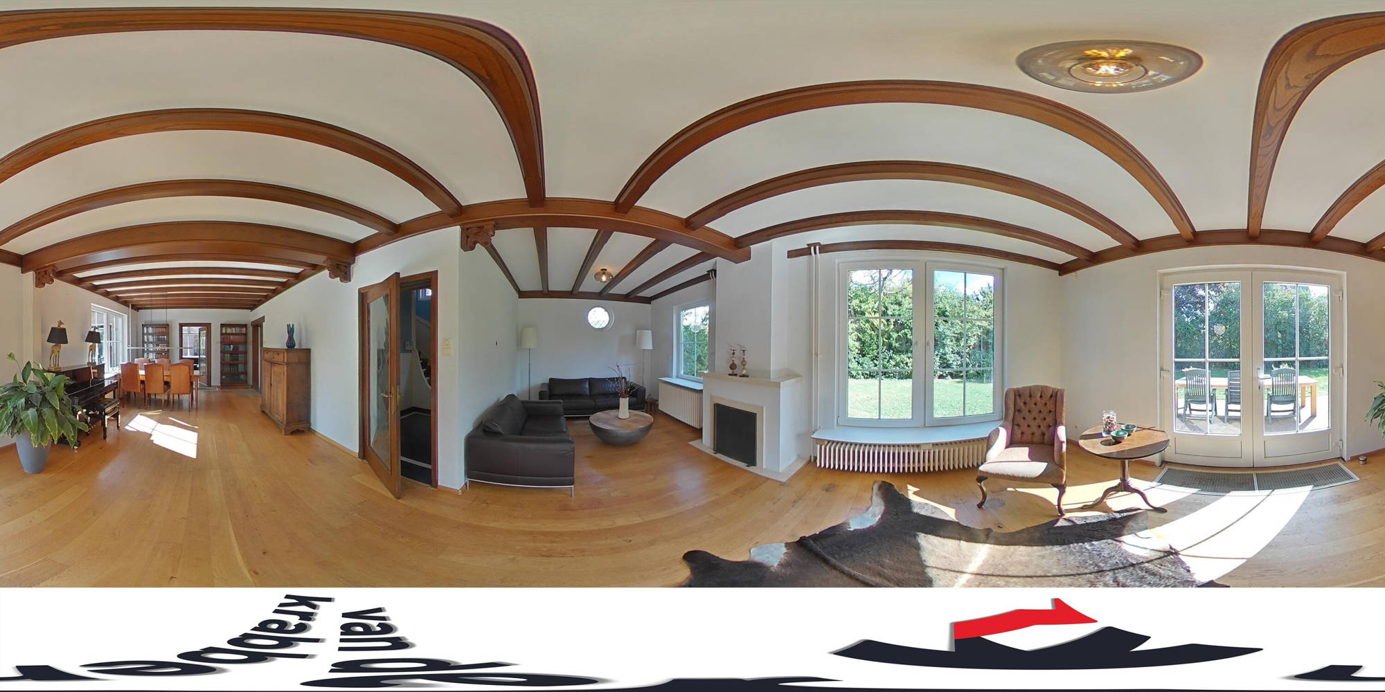 + De ruime tuinkamer met eiken vloer en vele raampartijen biedt een prachtig uitzicht over de volwassen tuin.