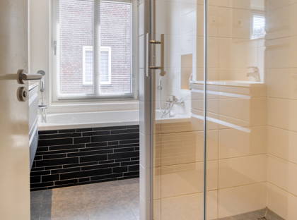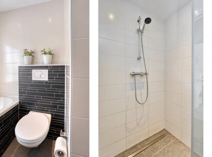 • Verzorgde badkamer met ligbad, inloopdouche, toilet, designradiotor, vloerverwarming, wastafelmeubel en infraroodlamp.
