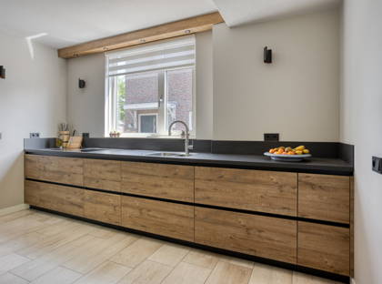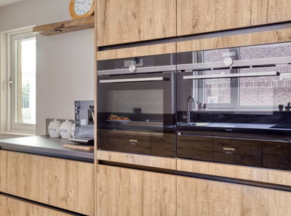 • Luxe keuken met stoomoven, Quooker, magnetron, warmhoudlade, natuursteen werkblad, inductiekookplaat met geïntegreerde afzuiging, koelkast en diepvries