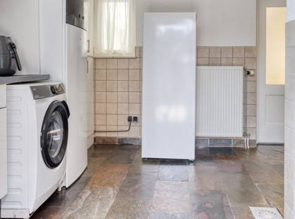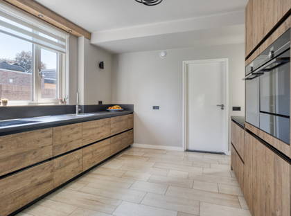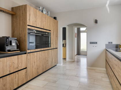 De keuken is ruim van opzet en voorzien van alle gemakken: van een inductiekookplaat met geïntegreerde afzuigkap, vaatwasser, Quooker, stoomoven, magnetron, warmhoudlade, koelkast en vriezer. Alles zit erin, strak ingebouwd en klaar voor gebruik. Aangrenzend vind je de bijkeuken, die naast een keukenblok ook plek biedt voor je wasmachine en droger. Ook de warmtepomp is hier netjes weggewerkt, en via de bijkeuken heb je toegang tot de lange oprit. Daarnaast is er een waterontharder aanwezig, wat bijdraagt aan extra wooncomfort en een langere levensduur van installaties.